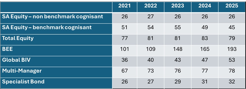 - Multi-managers continue to gain share: in 2019, for every R1 managed by single managers, multi-managers held 15 cents; by 2025 this increased to 30 cents.