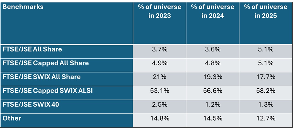This benchmark mix will change in 2026 as the JSE Index Harmonisation Project concludes, simplifying index structures and reducing overlap across FTSE/JSE indices.