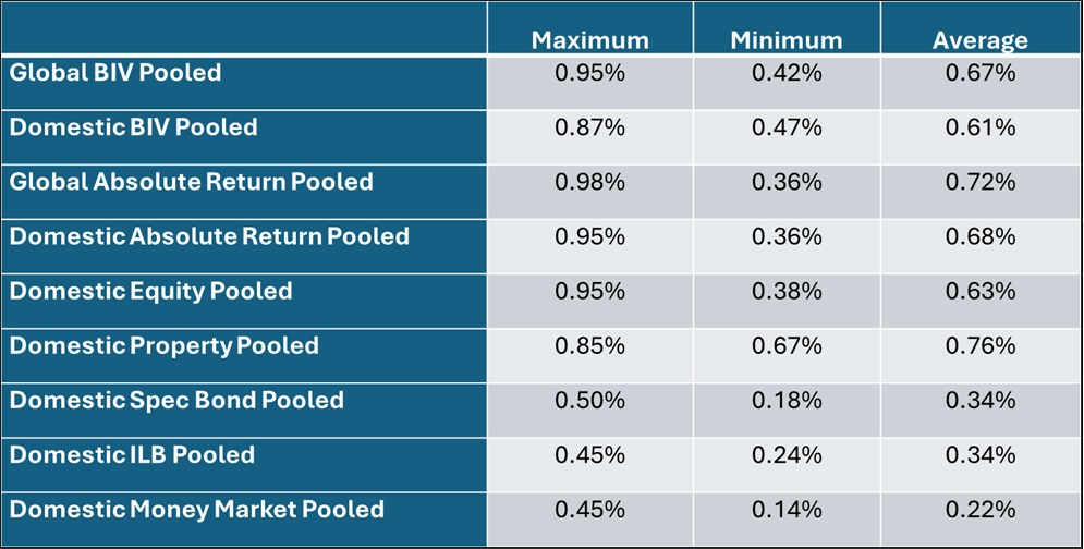 As part of the survey cycle, asset managers were asked to standardise base fees using a sliding scale across different AuM levels to support comparability. Alexforbes notes that this standardised approach may differ from individual managers’ actual fee structures.