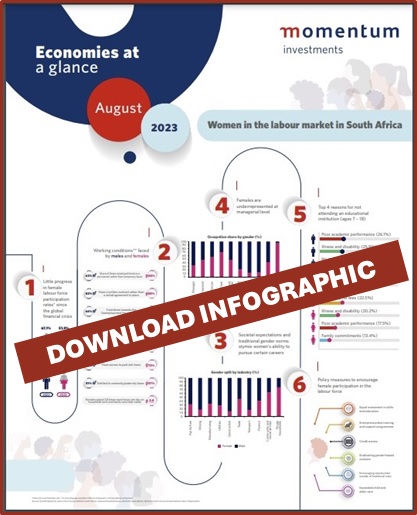 This month’s infographic features women in the South African labour market with a focus on the relatively flat growth rate in female labour force participation rates, working conditions, skewed gender representation on a sectoral basis given societal expectations and traditional gender norms, reasons holding back young females from completing their schooling and potential policy measures to encourage a higher level of participation in the labour market.
