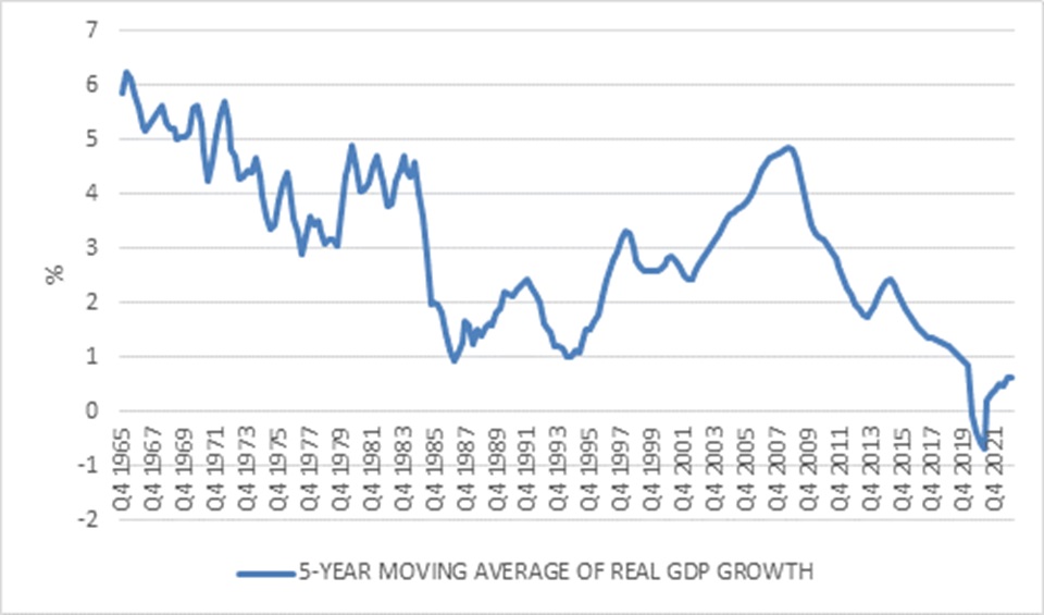 A slow-growing economy has several investment implications. Globally, low potential growth rates associated with ageing populations and excess savings, resulted in low interest rates for much of the past two decades, not just central bank policy rates, but long bond yields too. It is an open question whether the post-pandemic inflation surge has resulted in a permanent break from this era, or whether we will return to it in two or three years.