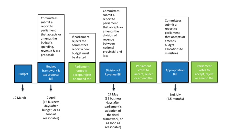 The process of signing a budget into law requires that four committees, each comprised of the full spectrum of political parties, accept or amend three ‘budget bills.” The committees draft reports on each bill and these are submitted to parliament within prescribed timeframes (Appendix A). Parliament then votes to accept, reject or amend the bills.