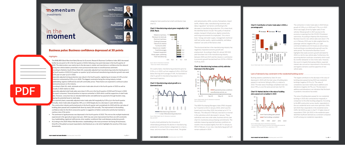 Momentum Investments have released their report based on Business pulse: Confidence depressed at 30 points prepared by the Momentum Investments Macro Research Team.