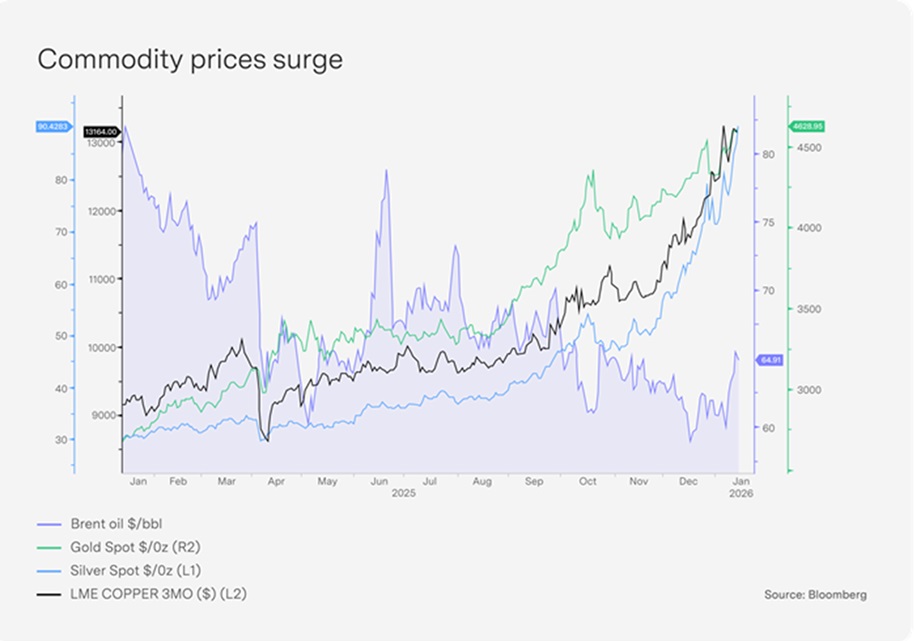 Metal and energy prices surged in January as investors navigated multiple global crises. Gold, silver, platinum, copper and tin reached new highs, while oil rebounded sharply. The rally stems from attacks on Federal Reserve (Fed) independence, tariff threats and escalating geopolitical tensions.