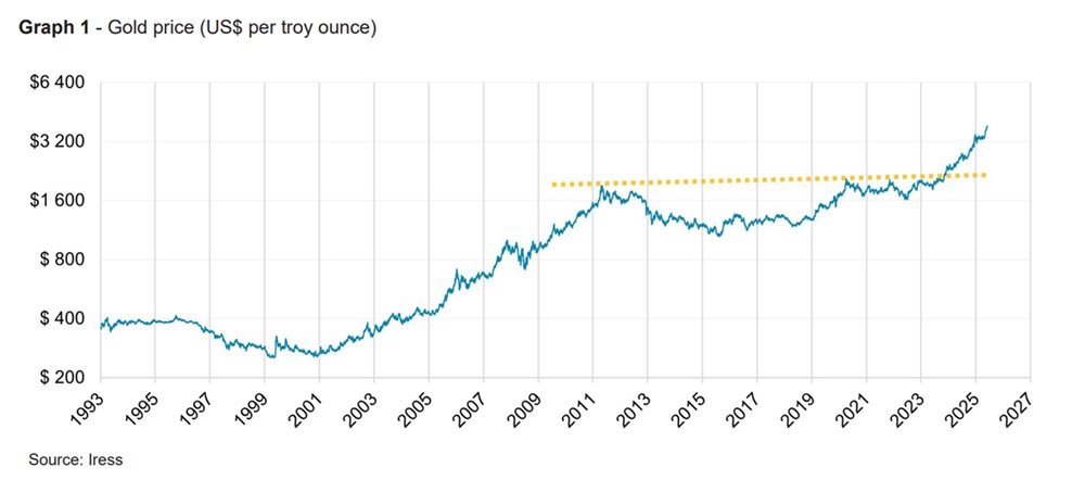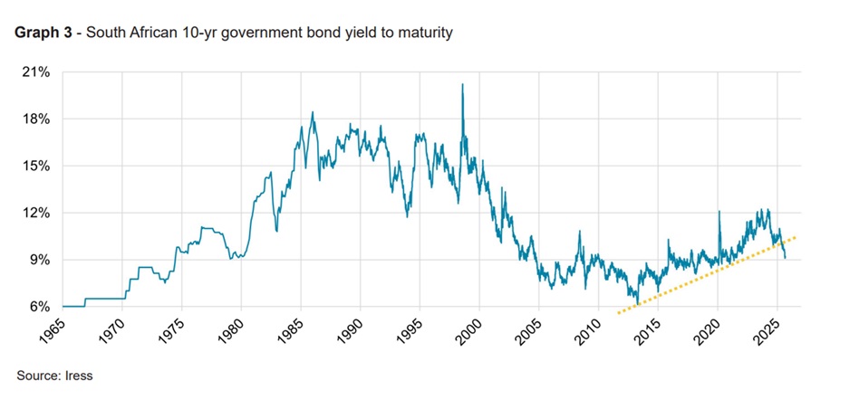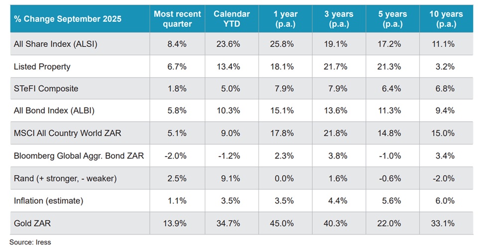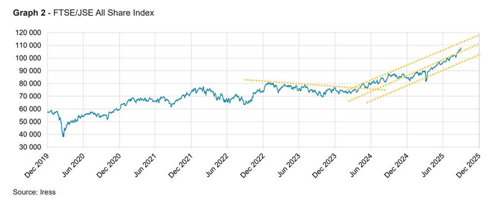 Developments in the economy and financial markets were mostly positive in Q3 2025. The prices of precious metals increased (gold, as illustrated in graph 1, silver and platinum) while shares and domestic bonds posted strong returns, and the rand strengthened to R17.27 against the US dollar.