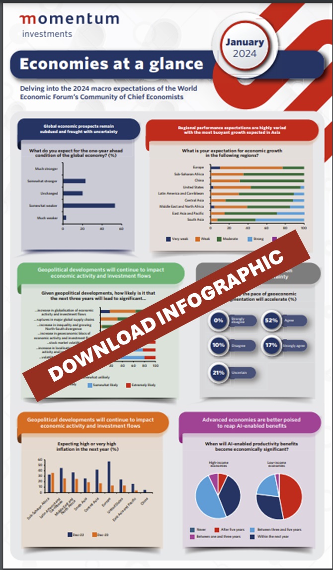 This month’s infographic features key expectations of the World Economic Forum’s Community of Chief Economists on growth, inflation and geopolitical developments for 2024.