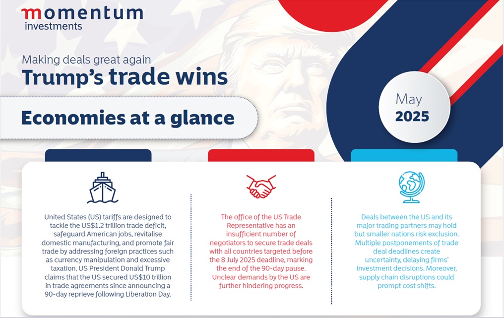 Sanisha Packirisamy, Chief Economist at Momentum Investments comments, “In our latest Economies at a Glance publication for May 2025, the infographic highlights key trade agreements secured by the United States under President Donald Trump, in an attempt to address America’s US$1.2 trillion trade deficit and to promote fair trade. From a US$600 billion deal with Saudi Arabia to tariff reductions with China, the United Kingdom, and others, these agreements aim to boost American jobs and manufacturing. Nations like India, Japan and Vietnam are actively negotiating to strengthen economic ties, while challenges remain with smaller economies risking exclusion given the limited number of trade negotiators and tight deadlines before the 90-day reprieve on reciprocal tariffs is lifted. Moreover, a looming Supreme Court challenge to Trump’s tariffs is creating uncertainty, delaying firms’ investment decisions and disrupting global supply chains.”