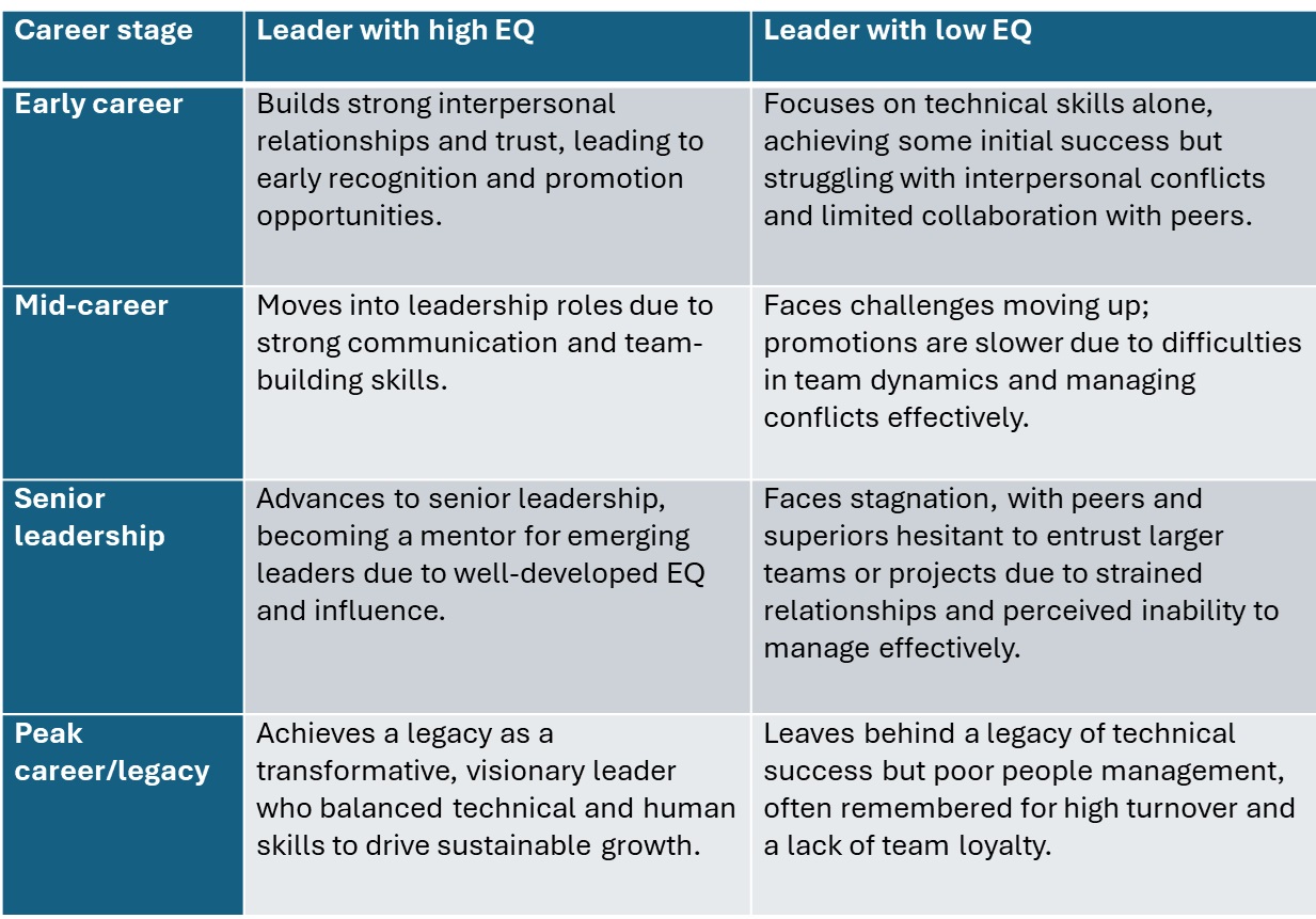 Here’s a comparative table illustrating the career progression of a leader who embraces EQ versus one who does not: