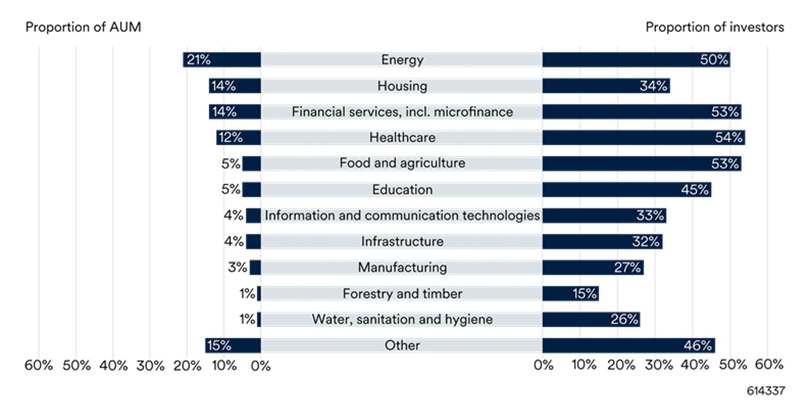 Investments linked to housing and financial services came in second and third respectively, with both accounting for 14% of impact AUM. Financial services incorporates microfinance, a segment that has helped to shape the modern impact investing market over the past two and half decades through a focus on offering inclusive access to commercial financing across emerging markets. It is also a space in which BlueOrchard, an impact asset manager that is part of the Schroders Group, is a recognised pioneer.