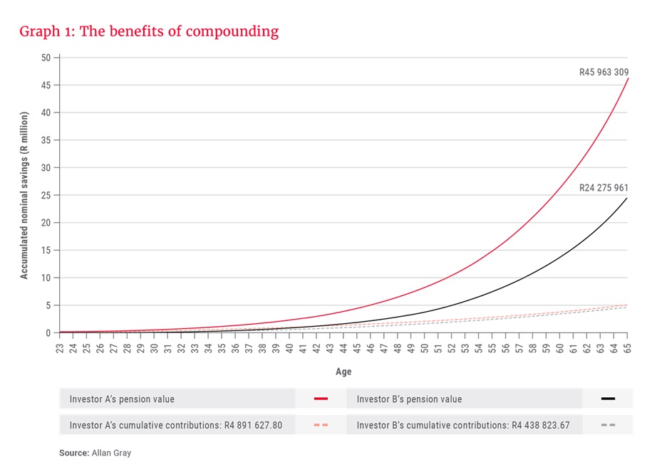 Investor A, represented by the red line, began saving 15% of their R20 000 monthly salary from their first paycheque at age 23, and increased their contributions annually in line with inflation (assumed to be 5%). Investor B, depicted by the grey line, earned the same salary but only began saving after 10 years of working. Assuming a nominal annualised investment return of 11%, after 42 years, Investor A ended up with 1.9 times (or 89%) more than Investor B at retirement; put differently, Investor B had a pension half the size of Investor A. Most of this difference came from compound growth – earning returns today on returns earned yesterday – illustrating the magic of this phenomenon.