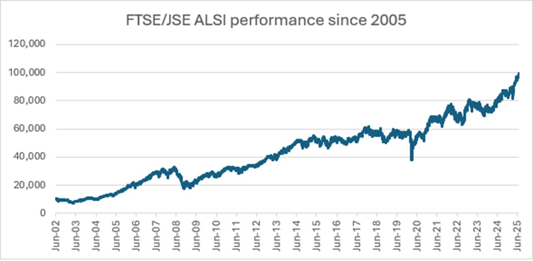 The ALSI has delivered robust long-term growth since 2002, overcoming global crises and commodity swings to reach a historic 100,000 points in 2025. The past five years (2020–2025) were particularly dynamic, with the index rebounding strongly from pandemic lows, driven by commodity booms (gold, platinum), resilient corporate earnings and improved investor sentiment. Key sectors like mining, banking and technology fueled gains, while structural reforms and fiscal stability underpinned the JSE’s rise as a gateway to African markets. This feat reflects both the index’s resilience and its role as a barometer of South Africa’s economic potential.