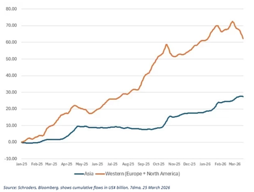 There has been a notable contrast between sharp selling in western markets, with much stickier demand in China. This is clear in the chart below, tracking physical gold ETF flows for Europe and North America vs Asia since the start of 2025.