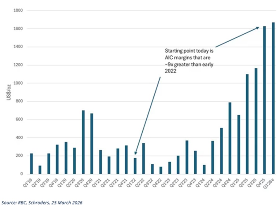 The biggest difference between now and 2022 is the starting point for producer margins. On an “all-in” basis(total costs including growth capital and cash taxes), margins were around ten times higher at the start of this conflict than they were at the start of the Russia/Ukraine war (approximately US$150/oz in early 2022 vs US$1,800/oz today), as shown in the chart below.