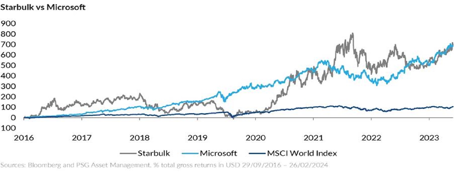 It might seem impossible that any stock could outcompete the current market leaders. However, consider this example from our portfolio history. Starbulk, in which we have been investors since 2016, is a global bulk shipping company which transports grains, iron ore, commodities and coal. After owning Microsoft since 2010 (when it was trading at US$25 and on a price-to-earnings ratio of 9 times), we sold our last shares in Microsoft in 2017 at $73 and switched some of the proceeds into Starbulk.