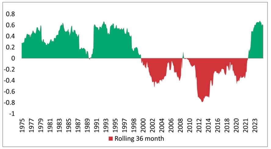 Rolling 36-month correlation between S&P 500 and US bond total returns