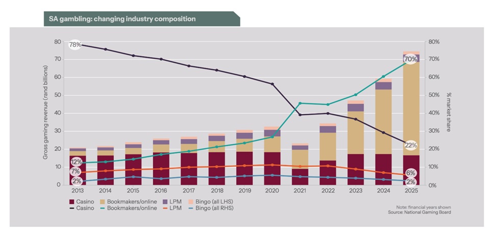 Online gambling has surged in South Africa over the past five years, overtaking all other forms to become the country’s largest gambling channel. This shift has reshaped the industry’s structure and competitive dynamics. Operators are increasingly prioritising online platforms to capture growth, while protecting profitability by improving operational efficiency and optimising their mature, land-based portfolios.