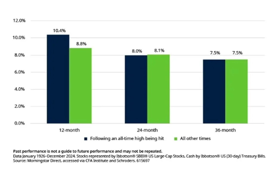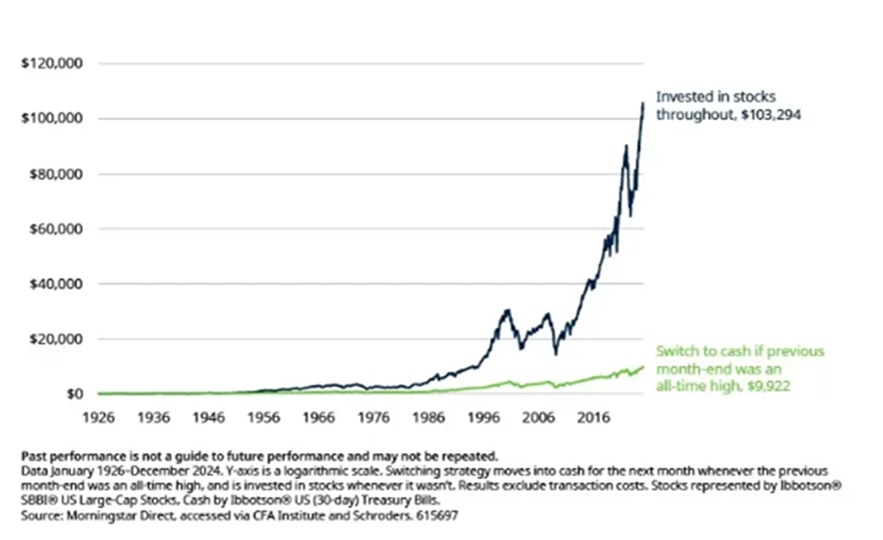 Data January 1926-December 2024. Y-axis is a logarithmic scale. Switching strategy moves into cash for the next month whenever the previous month-end was an all-time high, and is invested in stocks whenever it wasn’t. Results exclude transaction costs. Stocks represented by Ibbotson® SBBI® US Large-Cap Stocks, Cash by Ibbotson® US (30-day) Treasury Bills. Source: Morningstar Direct, accessed via CFA Institute and Schroders.