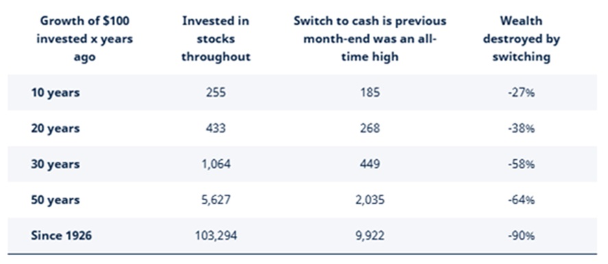 Selling stocks whenever the market was at an all-time high would have destroyed 90% of your wealth in the very long-run