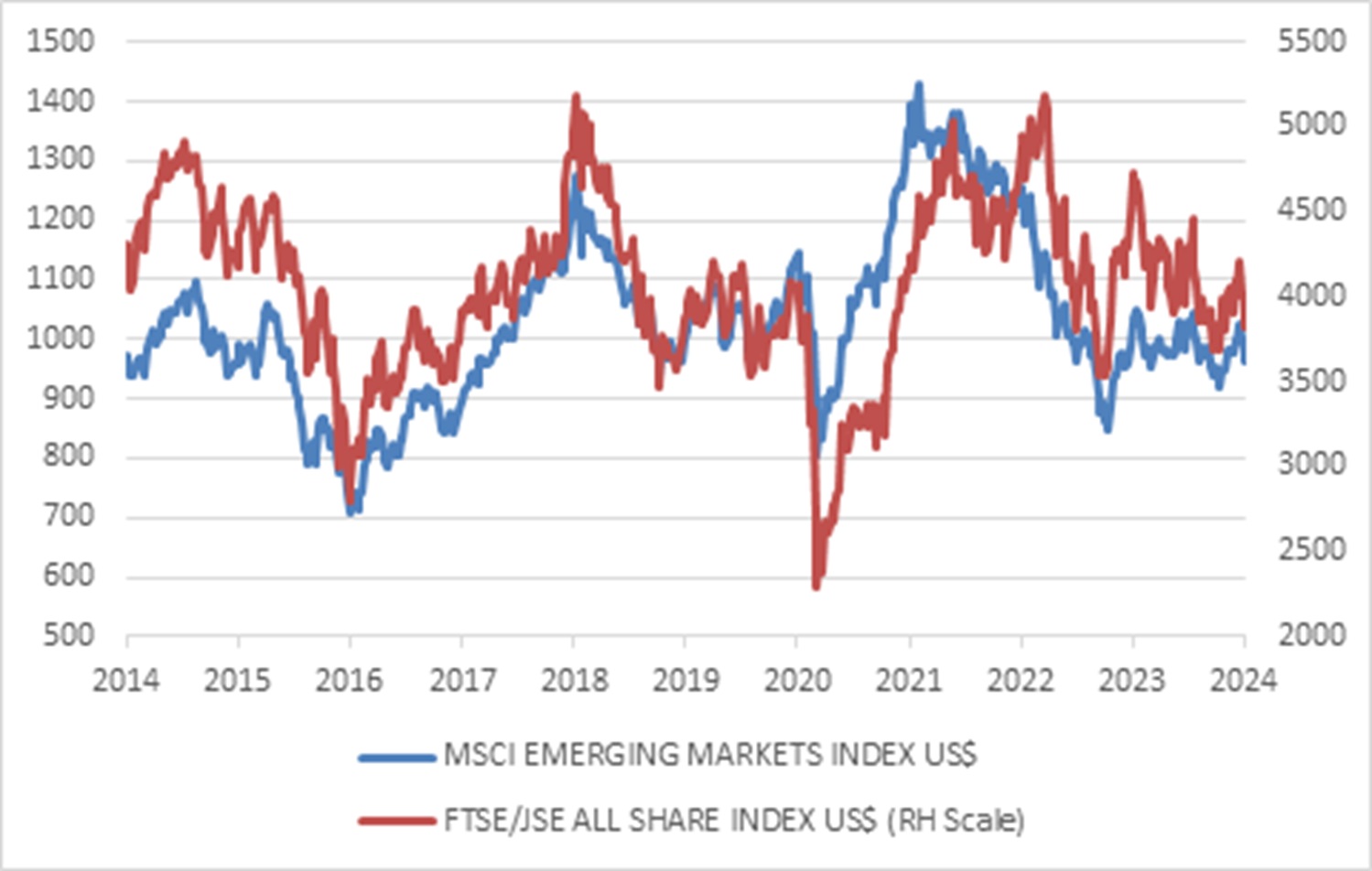 Chart 2: Emerging market and SA equities, US$