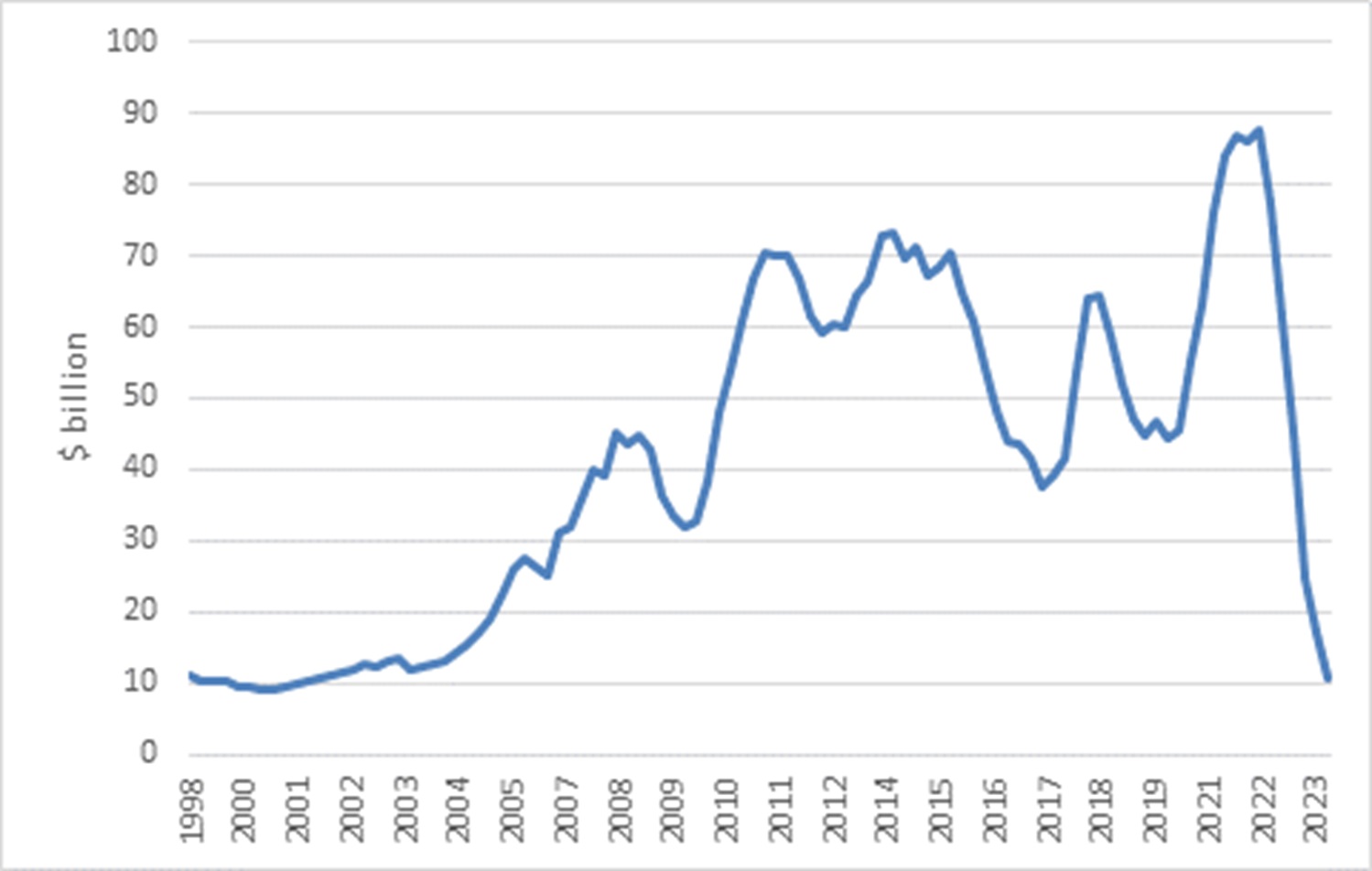Bond outflows have been less dramatic, but the foreign ownership share of government bonds has declined notably, from around 40% to 25%. As the government has issued more and more bonds, they have primarily been bought by local banks, pension funds and unit trusts (as income funds have gained in popularity).