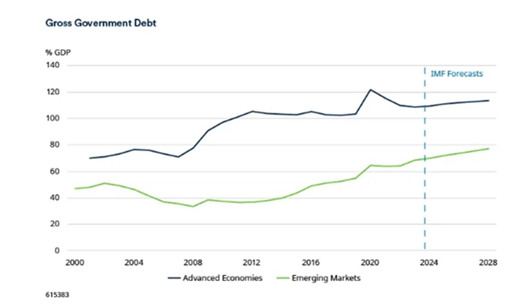 With many major sovereigns still running large budget deficits, the International Monetary Fund (IMF) expects government debt to climb even further in the years ahead to around 100% of global GDP. Within that, gross government debt is expected to touch 250% of GDP in Japan and continue to climb further above 100% of GDP in the US, Italy, France and the UK.