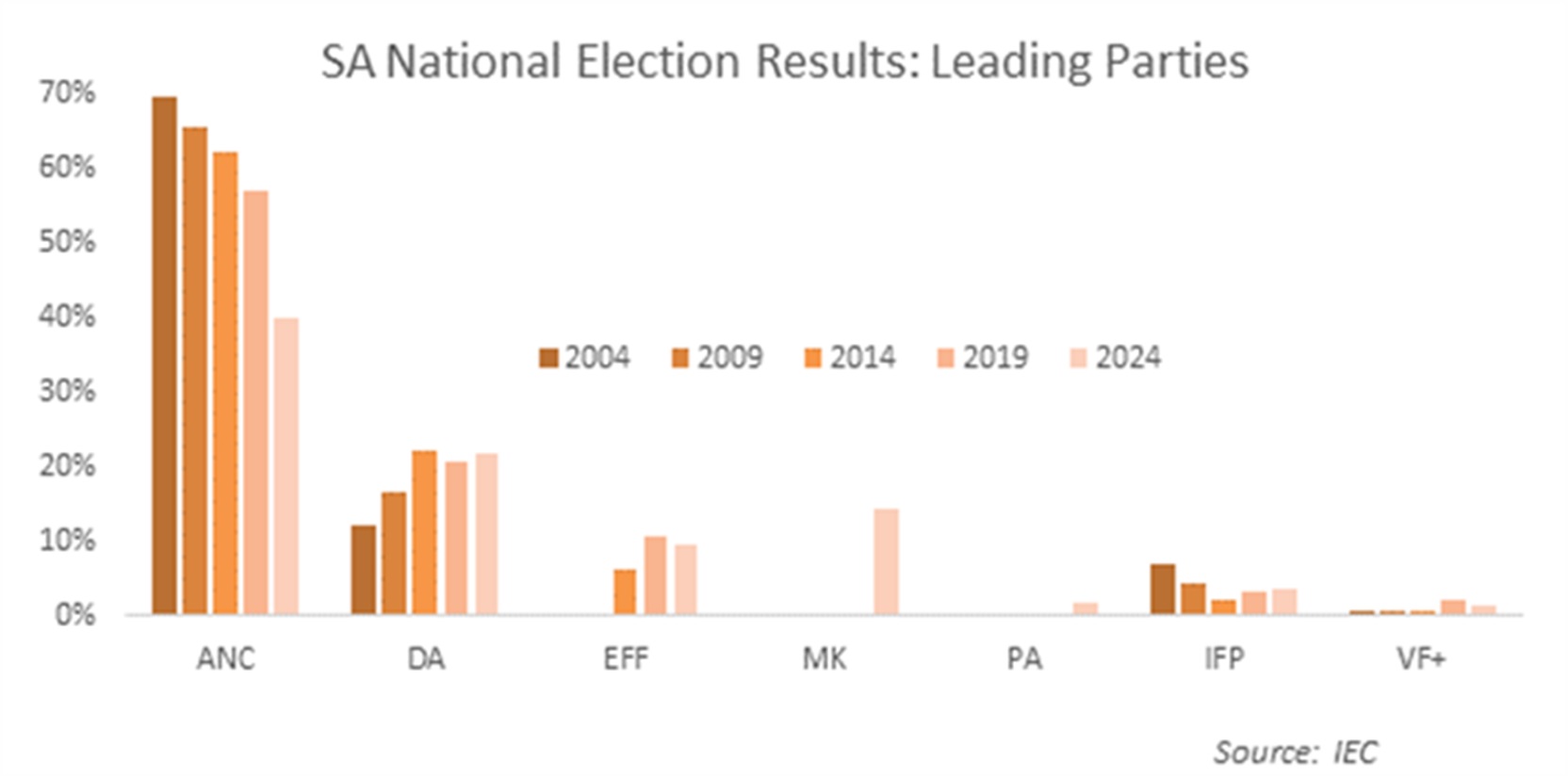In the weeks running up to the election, the broad consensus among local and international investors was that the ANC would get between 45% and 50%, allowing it to remain in power with the help of one or two smaller parties. However, its losses were too big and it will need to partner with one of the large parties – the MKP, EFF or DA – in a formal or informal coalition arrangement.
