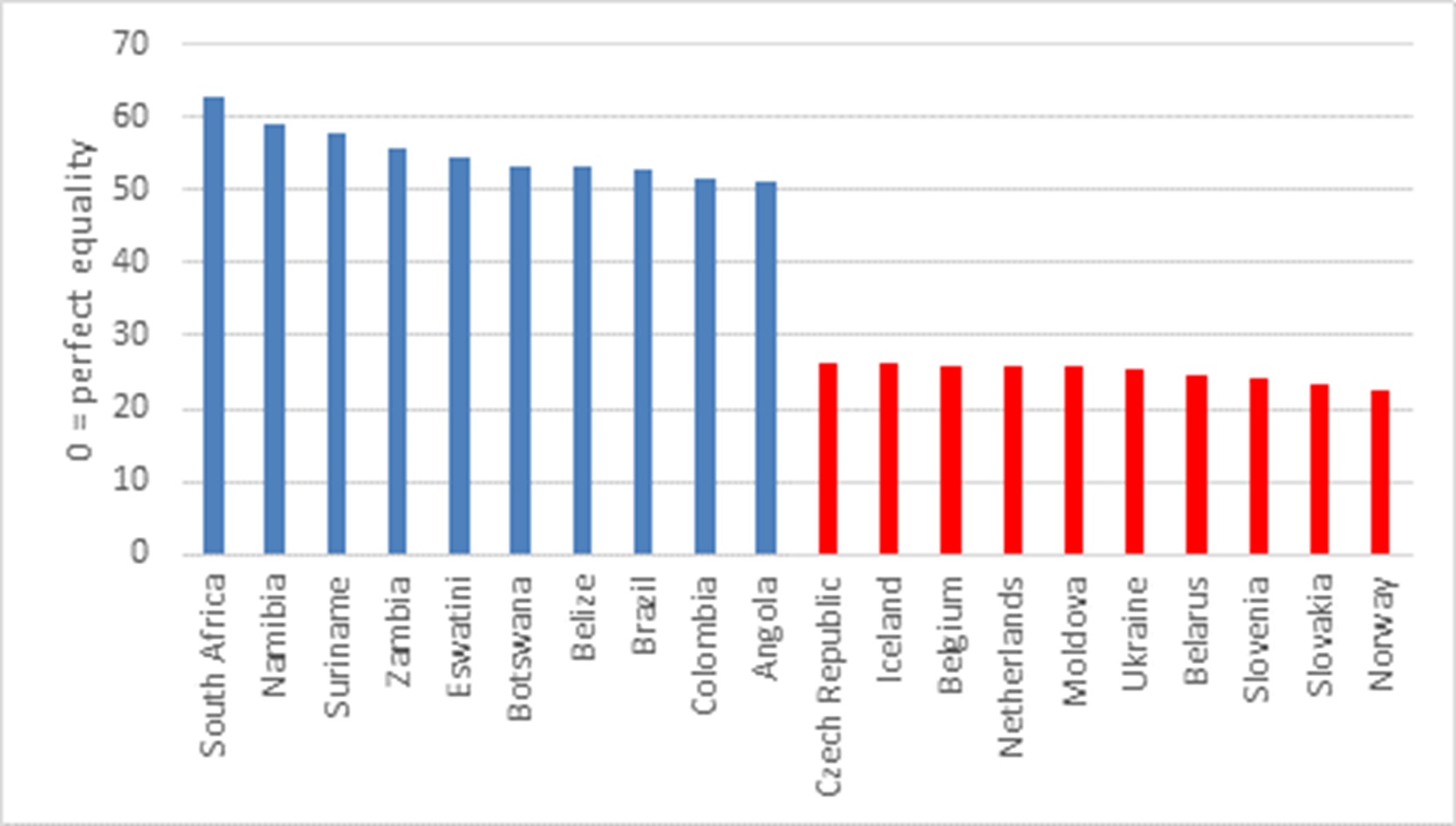 Chart 2: Top 10 and bottom 10 countries by the Gini coefficient