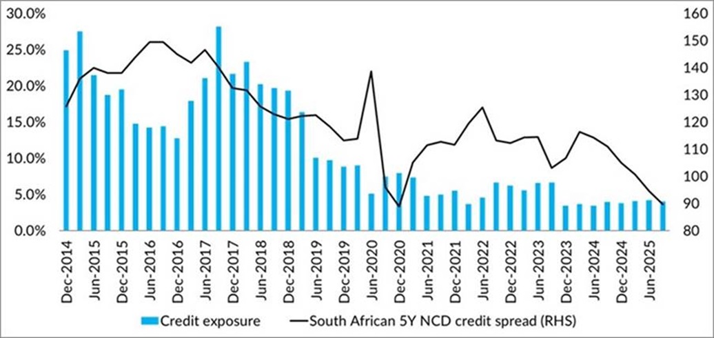 We see a similar trend across South African credit markets, with substantial demand for these instruments even at yields that we don’t believe fully compensate investors for the credit risk. With credit expensively priced, in our view, we have much less credit today than we have historically held. The decline in credit holdings in PSG Stable Fund as credit becomes less attractive (illustrated by the 5-year NCD credit spread) is evident in the chart below.