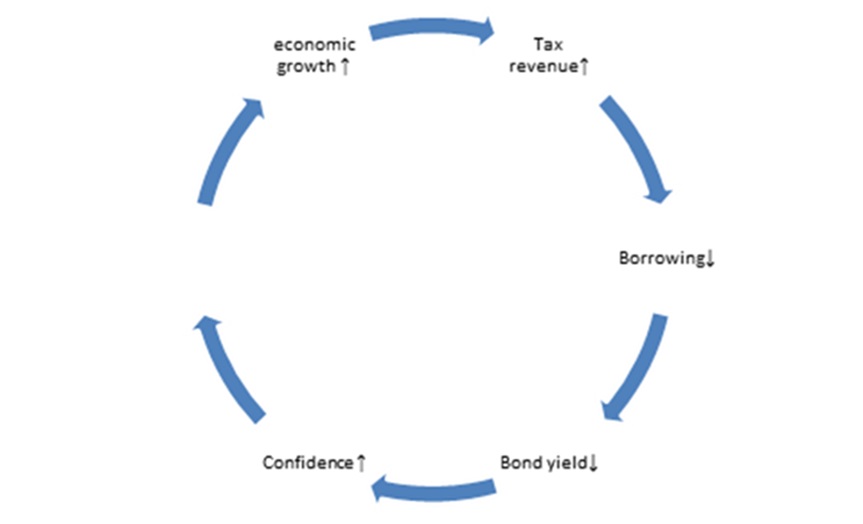 Therefore, achieving taster economic growth remains key to putting government finances on a sound footing over the longer term and turning the vicious cycle into a virtuous cycle of falling borrowing costs and faster growth as shown in chart 4.