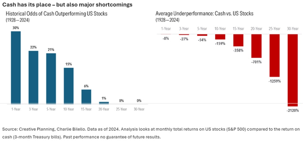 Source: Creative Planning, Charlie Bilello. Data as of 2024. Analysis looks at monthly total returns on US stocks (S&P 500) compared to the return on cash (3-month Treasury bills). Past performance no guarantee of future results.