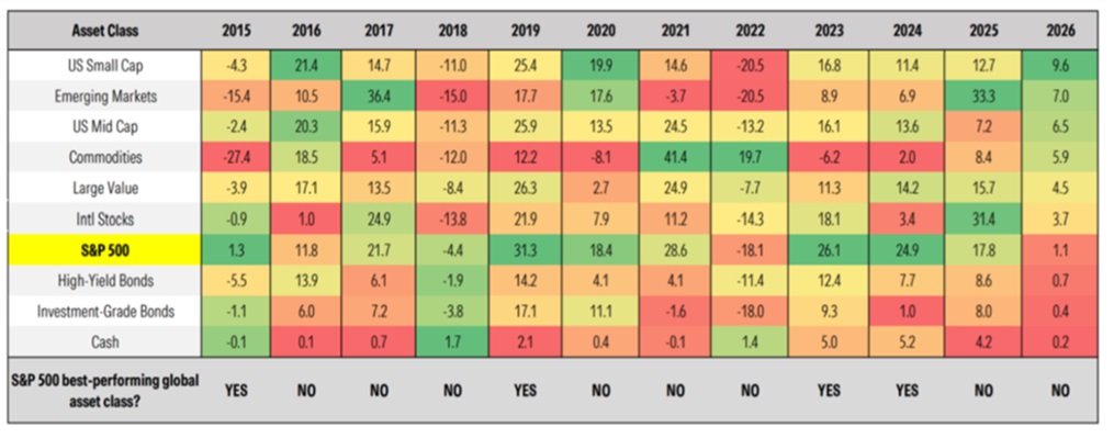 This is where today’s market environment becomes especially relevant. When returns become driven by a narrow part of the market, whether a handful of mega-cap stocks, one country, or one investment style, portfolios can quietly become riskier. No asset class, market, or manager outperforms all the time. History shows that leadership rotates, often when investors least expect it. Diversification across regions, asset classes, and investment styles isn’t about smoothing every bump, it’s about reducing dependence on a single outcome going right. As Morningstar’s latest research points out, putting “too much in one place” can feel comfortable when it’s working, but it can quickly become the dominant source of risk when conditions change.