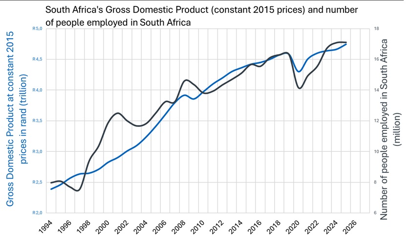 South Africa’s employment levels track closely with GDP performance. When economic activity contracts, employment stagnates or declines; when growth accelerates, job creation follows. The data confirms this tight coupling: the correlation coefficient between GDP (constant 2015 prices) and employment is an exceptionally high 0.95.