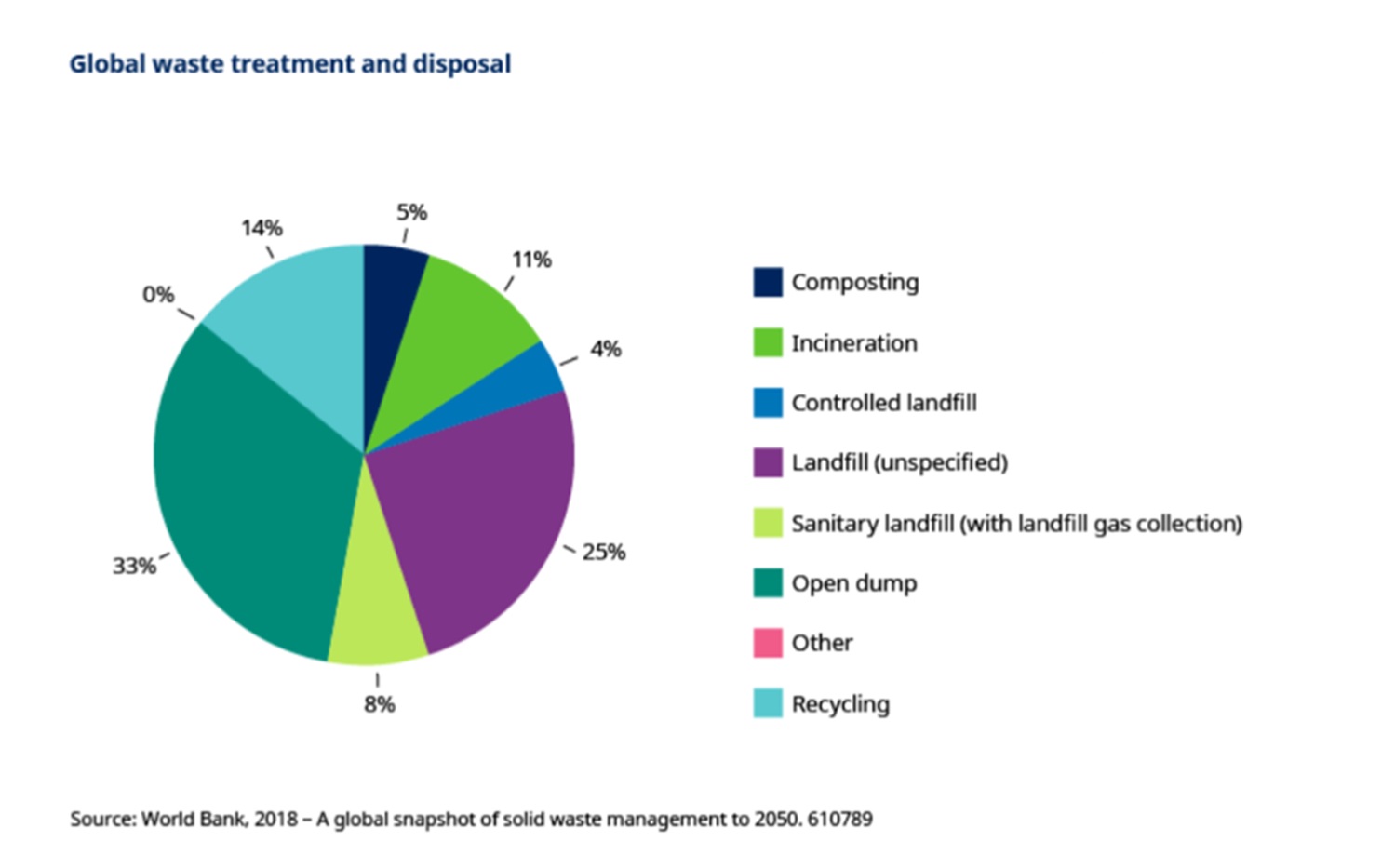 We can see from the below chart that the vast majority of waste globally is either openly dumped (c. 33%) or landfilled (c. 37%) with only 19% being either recycled or composted. About 11% of waste is disposed of via incineration (known as waste to energy).