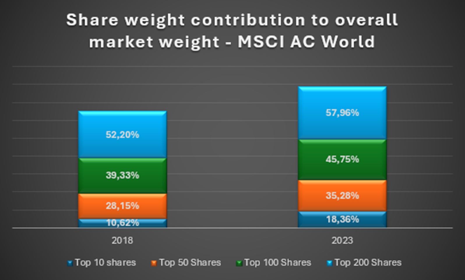 The share concentration in the global equity market has increased quite significantly, mainly due to the abnormally large difference in growth in a select few stocks versus the rest of the market.